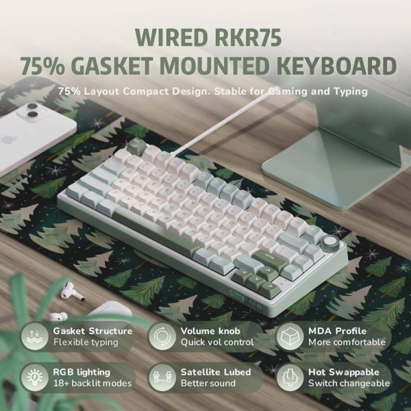 კლავიატურა Royal Kludge RK R75 RGB Mechanical Keyboard, Brown switch, Hot Swappable, Type-C wired, Sky Cyan