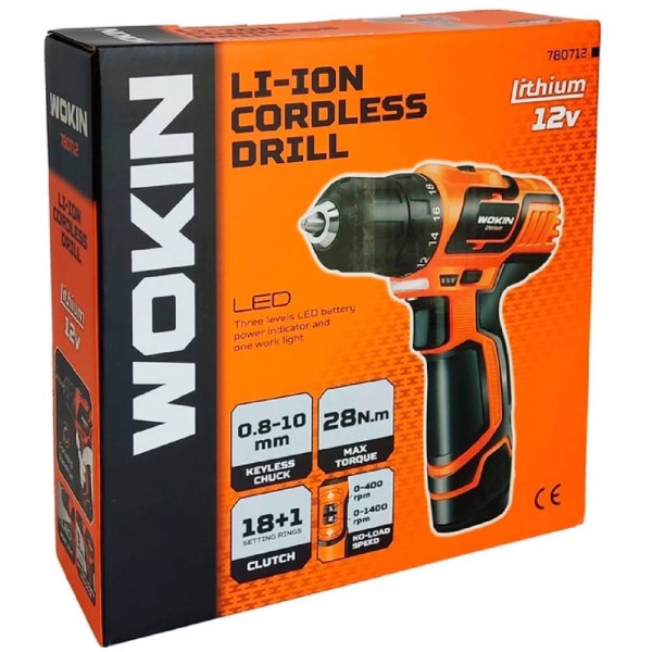ელექტრო სახრახნისი Wokin 780712, 1400Rpm, Li-ion Cordless Drill, Black/Orange