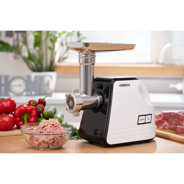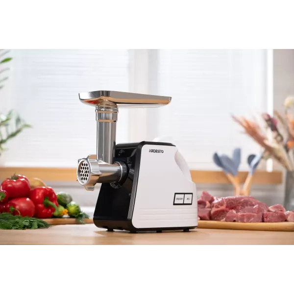 Ardesto ხორცსაკეპი Meat grinder, 2300W, prod.-2.2kg/min, 4 cutting plates+for sausag.plates, tomato juicer, plastik, white-black