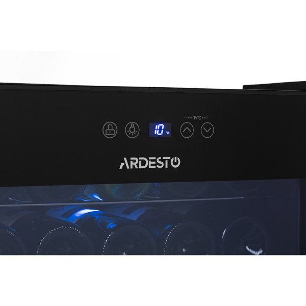 Ardesto ღვინის მაცივარი Wine cooler, 64.2x48x44, freez.-66L, 1 zone, bottles -24, ST, display int, black